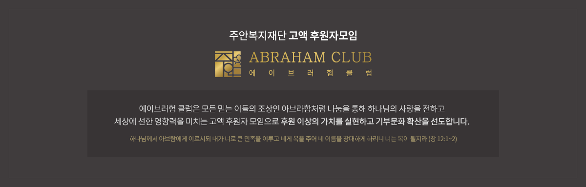 “에이브러험 클럽”은 경제적으로 어려움에 처해있는 국내/외 저소득 가정 및 소외계층(장애인, 다문화 가정 등)을 돕기 위한 주안복지재단 고액 후원자 모임입니다.