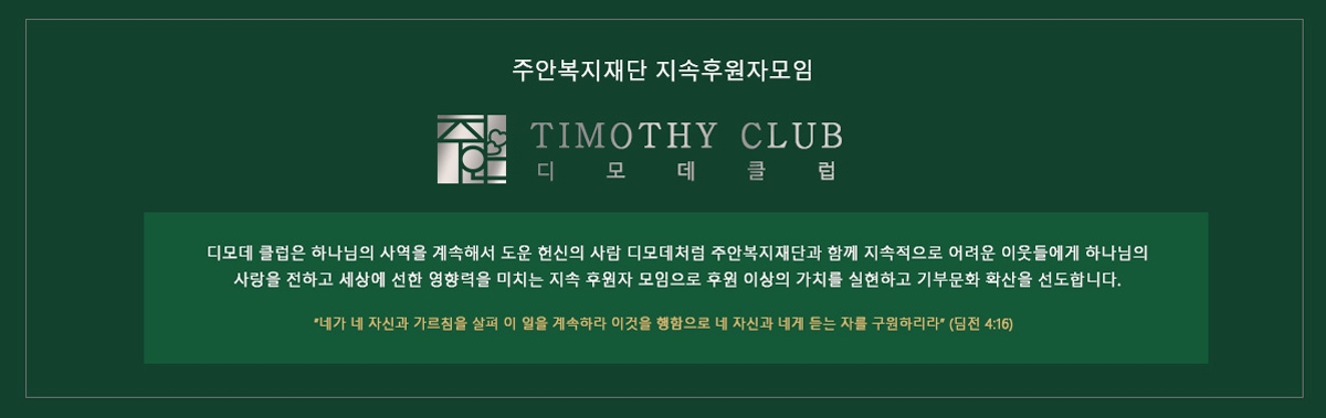 “디모데 클럽”은 경제적으로 어려움에 처해있는 국내/외 저소득 가정 및 취약계층(장애인, 노인, 다문화 가정 등)을 돕기 위한 주안복지재단 장기 후원자 모임입니다.